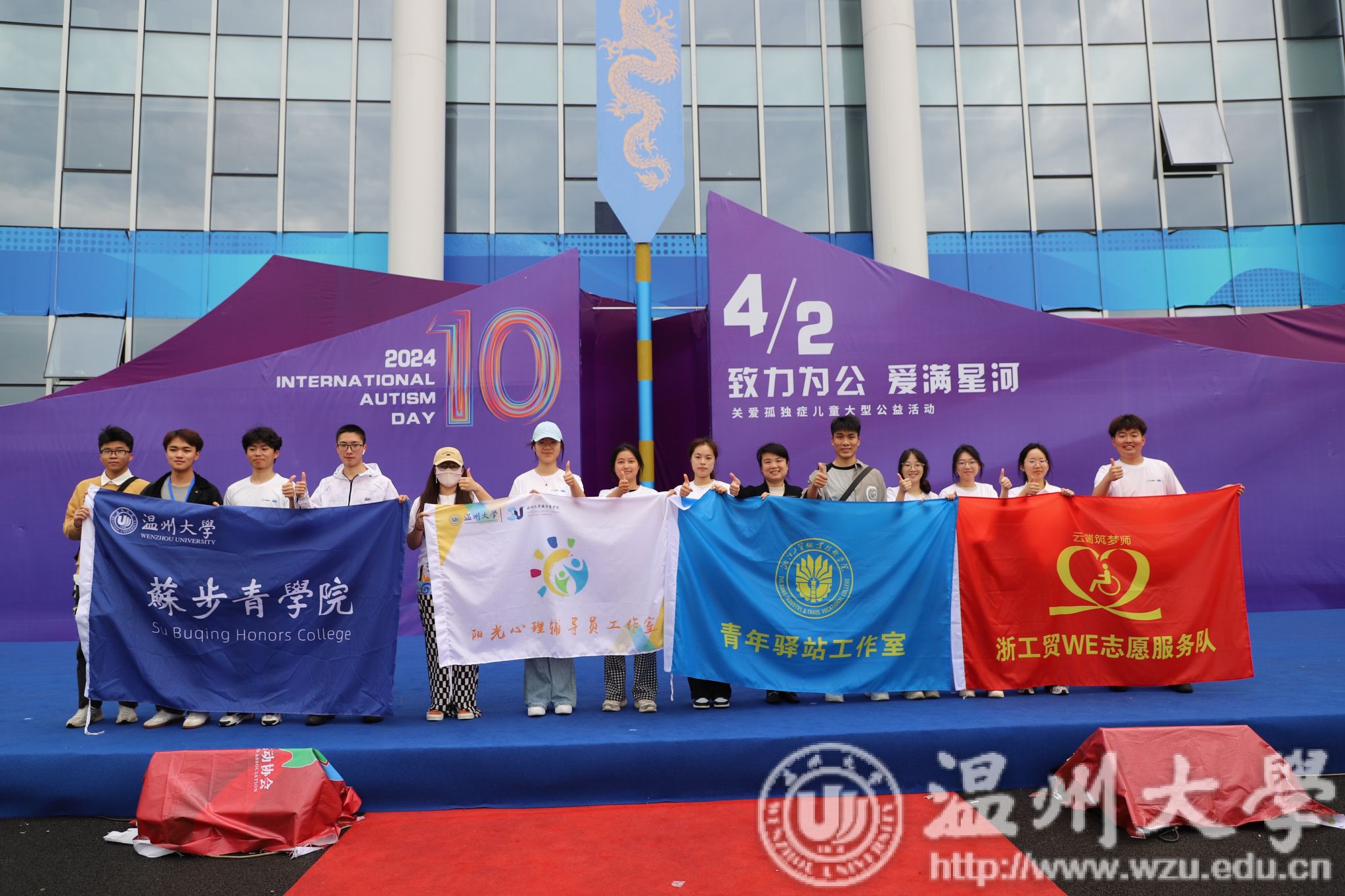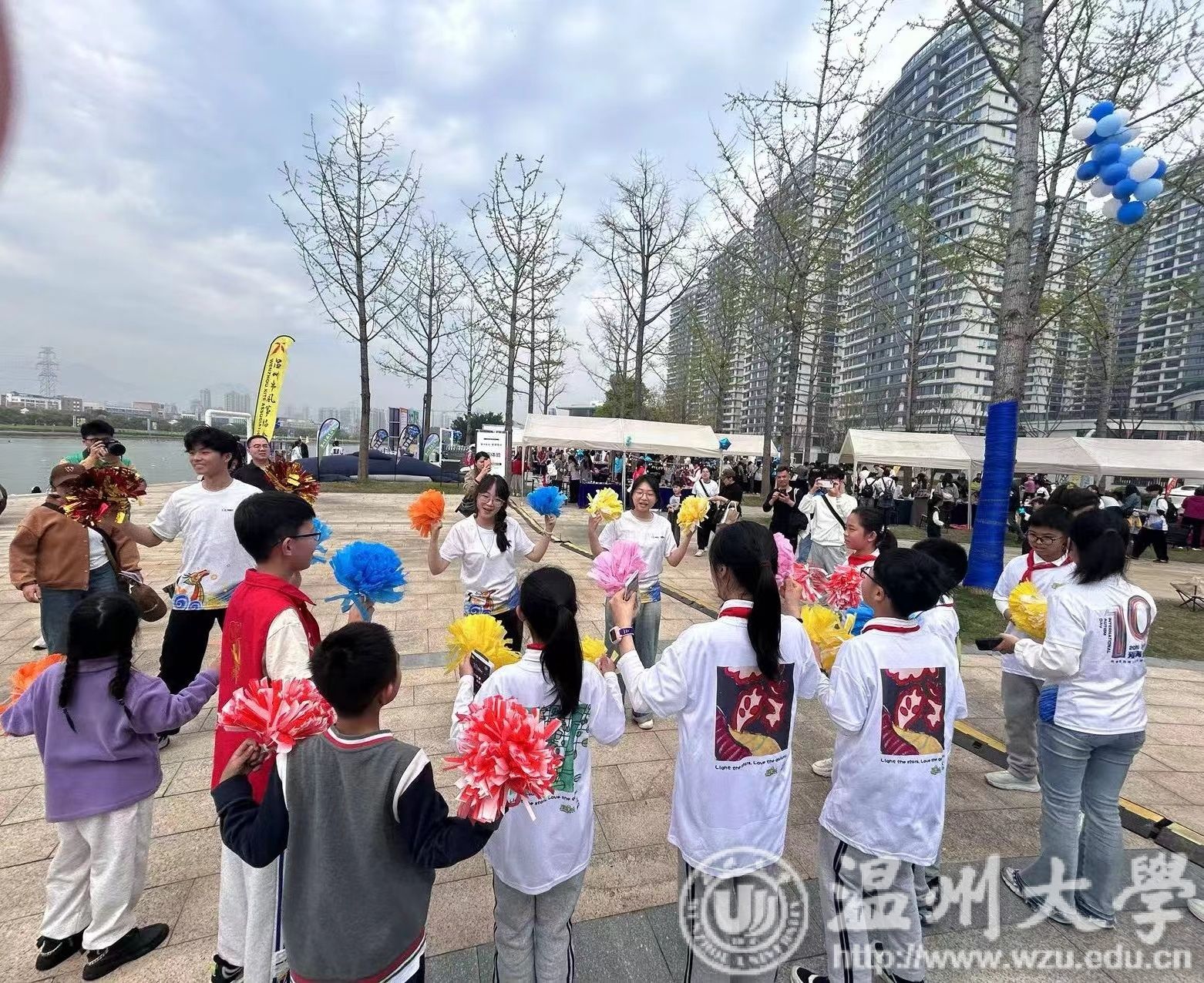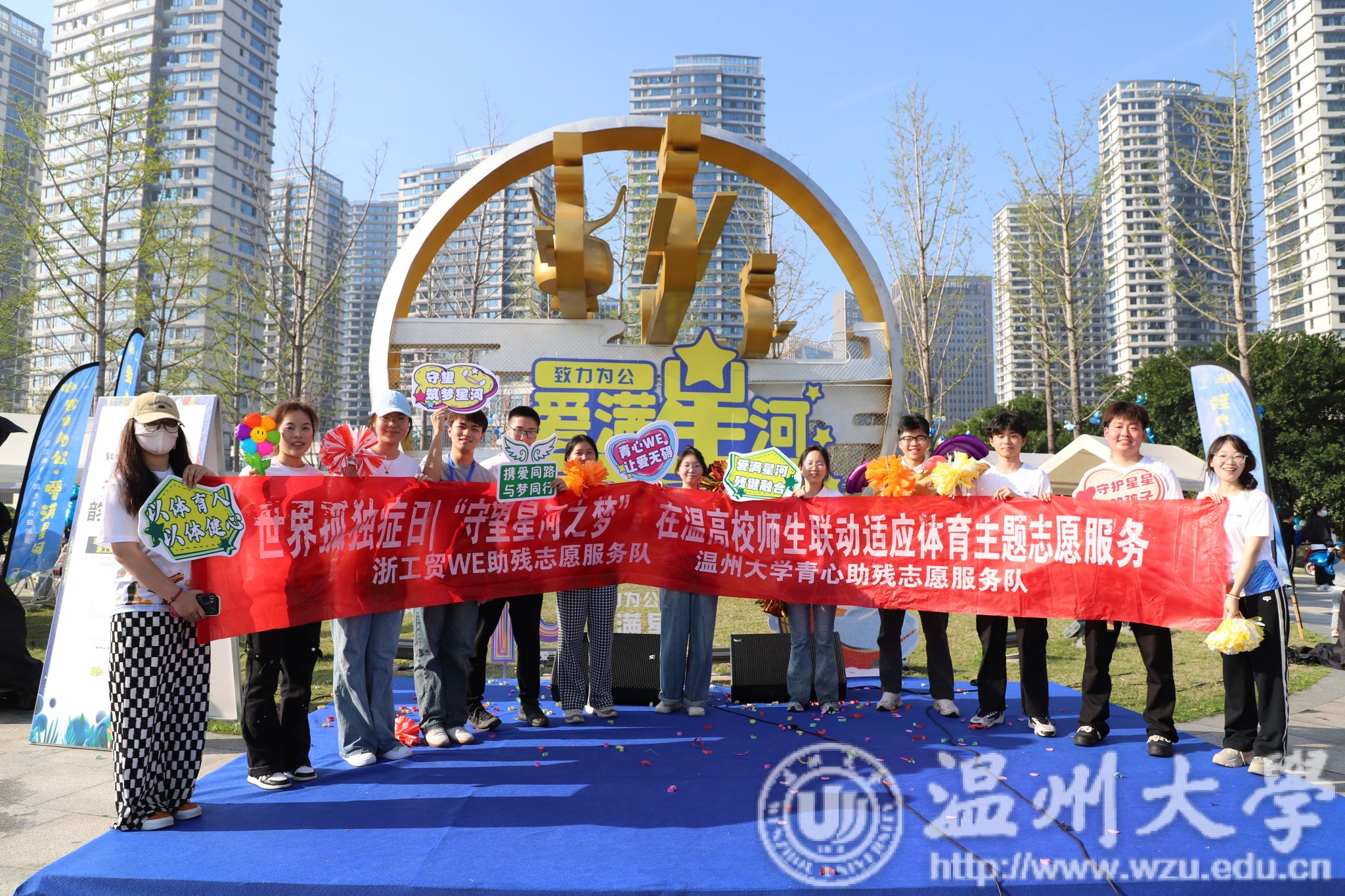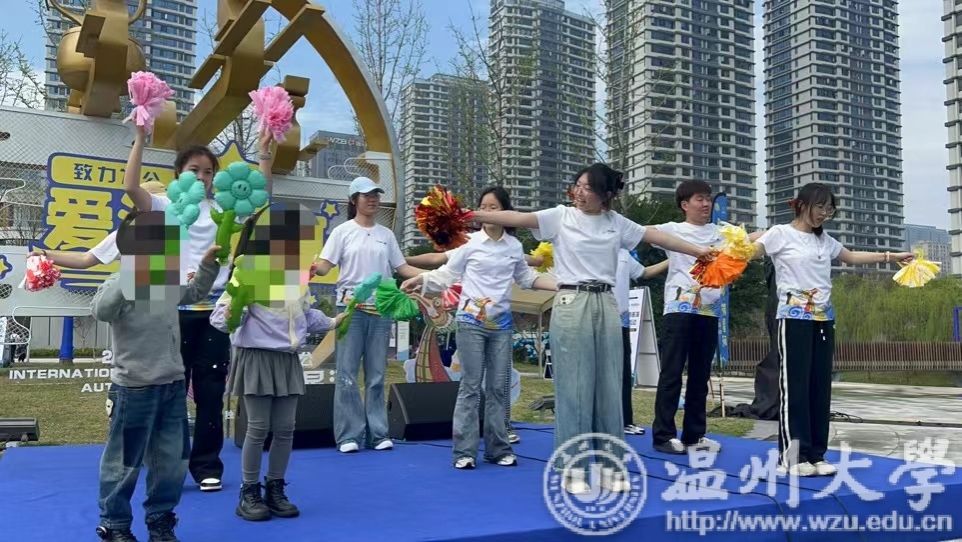 330日,在第十七个“世界孤独症关注日”来临之际由益起行组织发起的“致力为公,爱满星河”关爱孤独症儿童大型公益活动现场,大学生助残志愿服务队在温州市龙舟运动中心,给300户孤独症家庭提供韵律啦啦操课堂体验。