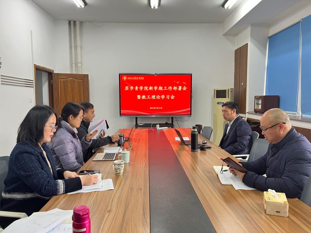 组织召开新学期工作部署会暨教工理论学习会,党总支书记应中、执行院长姜锐及全体教职工参加会议,会议由应中书记主持。