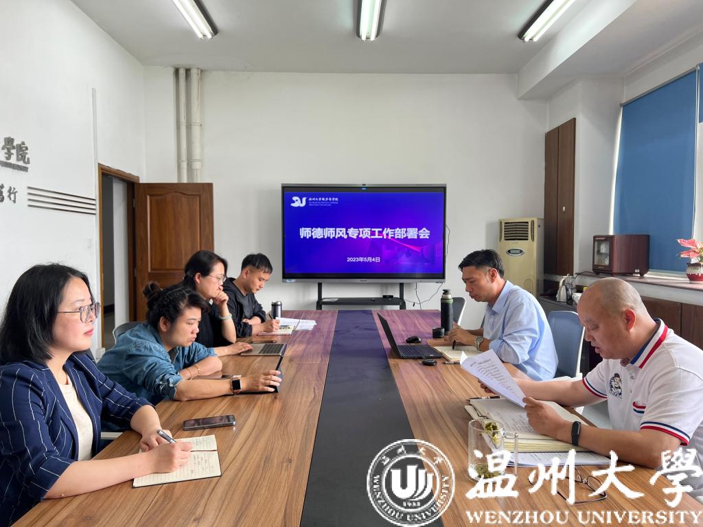 会议首先由应中传达学校师德师风专项工作部署会议内容。应中从专项整治工作背景、目标任务、整治重点、总体安排、工作要求等五方面解读了《温州大学师德师风问题专项整治工作实施方案》,并指出要认真领悟张健书记关于开展师德师风问题专项整治工作的重要讲话,即:提高站位、深化认识,切实增强师德师风建设的责任感使命感;对标对表、突出重点,推深做实师德师风建设各项工作任务;压实责任、加强考核,确保师德师风建设取得扎实成效。