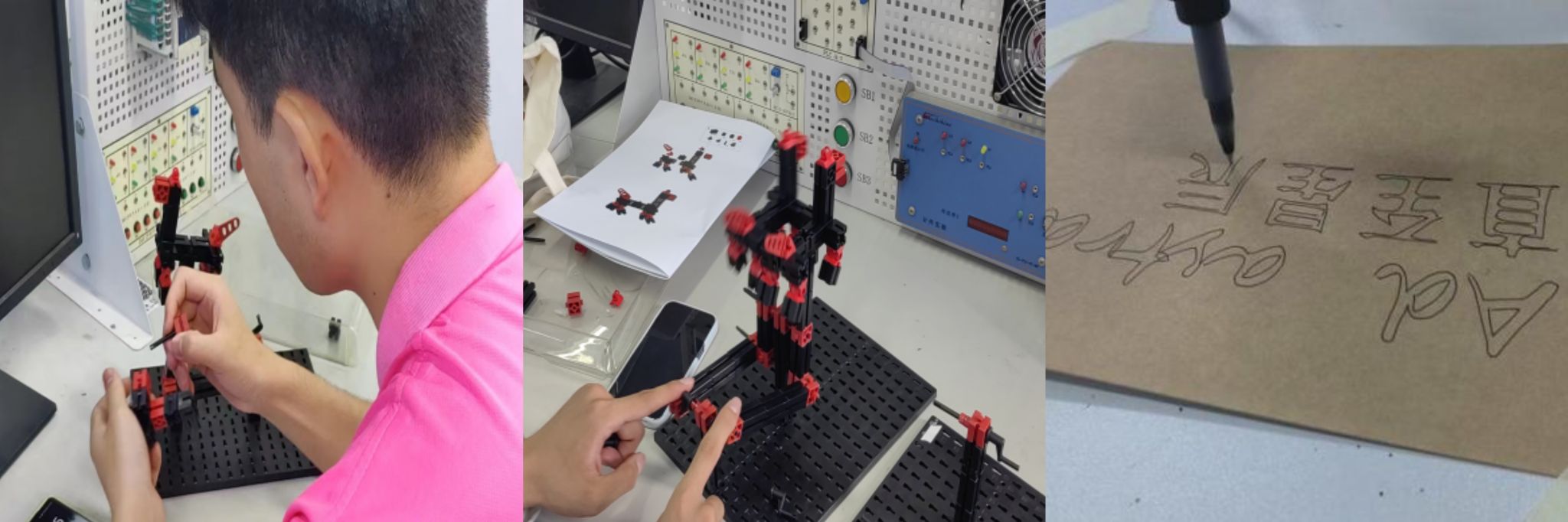 随后,老师引领我们步入了传统机械的世界,详解铣床的奥秘,其详细介绍了铣床的工作原理和操作流程,使得同学们在体验中领略了传统工艺的智慧与魅力。最后的四轴机械臂项目,更让我们体会了人工智能与机器人的魅力。在教师的指导下,我们学会了如何编程控制机械臂完成简单动作—叠纸杯、写字画画等项目。学员们还化身为小小工程师,发挥自己的想象力和创造力,利用慧鱼积木搭建出各种各样的模型。